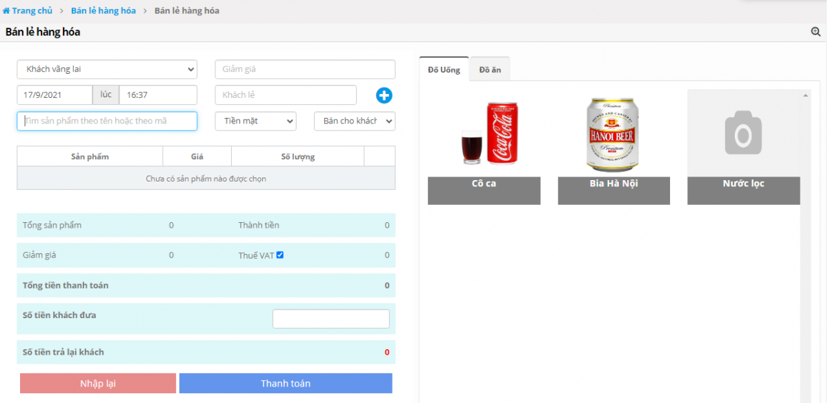 Chọn mặt hàng mà khách hàng mua. Rồi chọn thông tin hình thức thanh toán, số tiền khách đưa... Sau khi điền đầy đủ thông tin bấm "Thanh toán".png)