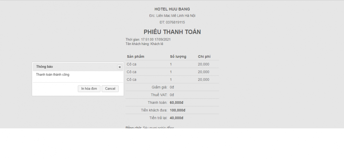 In hóa đơn: "In hóa đơn" hoặc bấm "Cancel" để quay lại màn hình chính