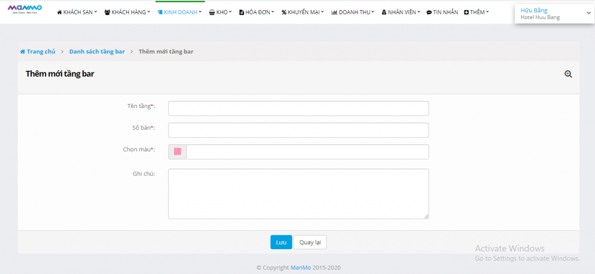 Thêm mới tầng bar: những thông tin bắt buộc là: tên tầng, số bàn, chọn màu, chọn “Lưu” để lưu vào hệ thống.