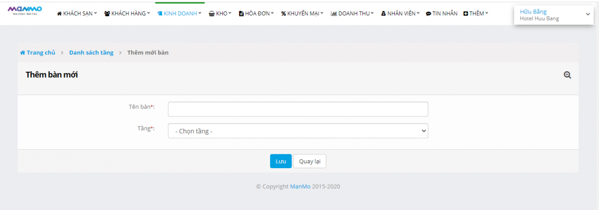 Thêm bàn nhà hàng mới: điền tên bàn, chọn tầng, chọn “Lưu” để lưu vào hệ thống.