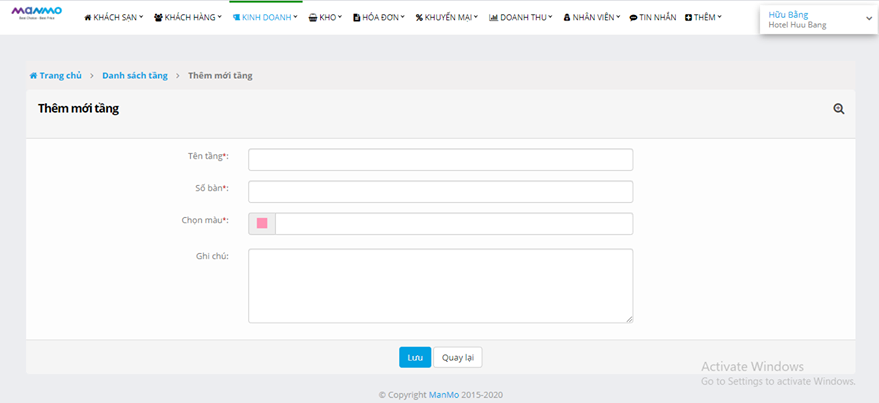Thêm mới tầng: thông tin bắt buộc: tên tầng, số bàn, chọn màu, chọn “Lưu” để lưu tầng vào hệ thống.