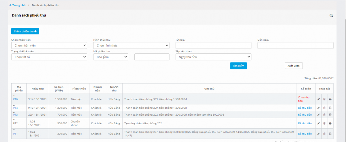Phiếu thu có tính năng cho kế toán đối soát phiết thu hàng ngày