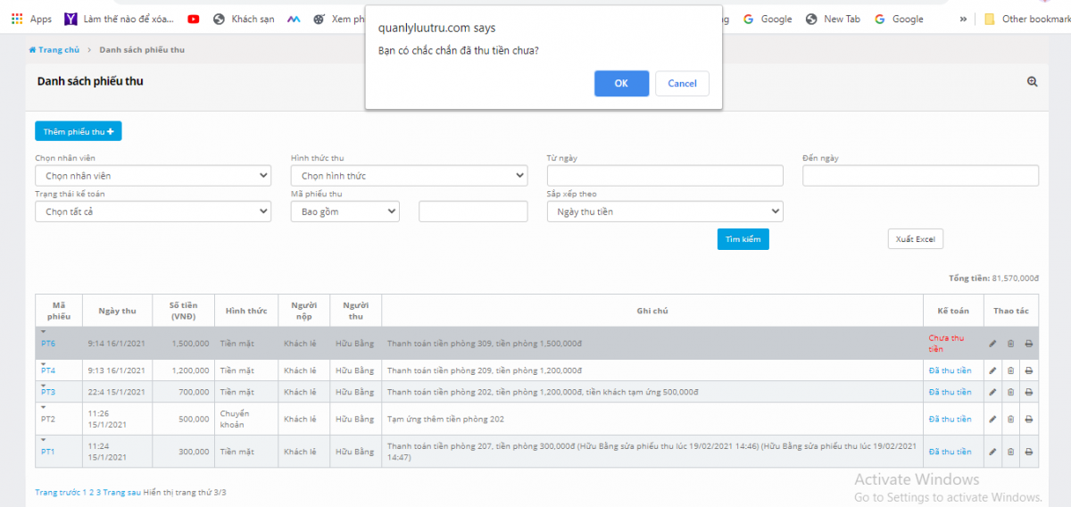 Chọn icon thùng rác để xóa một phiếu thu