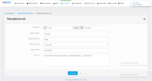 Chọn “Thêm phiếu thu” để thêm một phiếu thu mới