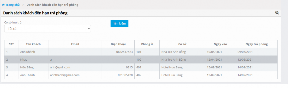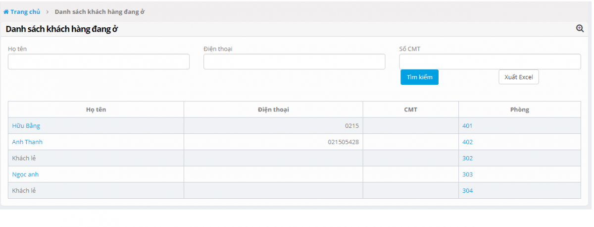 Người quản lý có thể tìm kiếm khách hàng theo các tiêu chí: họ tên, số điện thoại, số CMT, cơ sở lưu trú khi quý vị nhập đầy đủ thông tin khi khách hàng nhận phòng