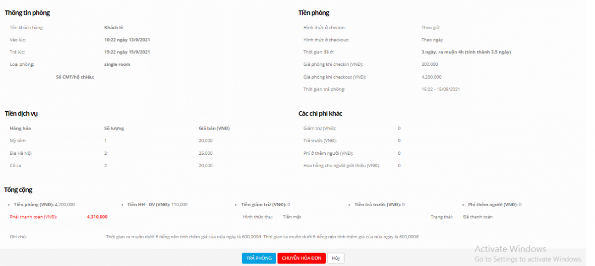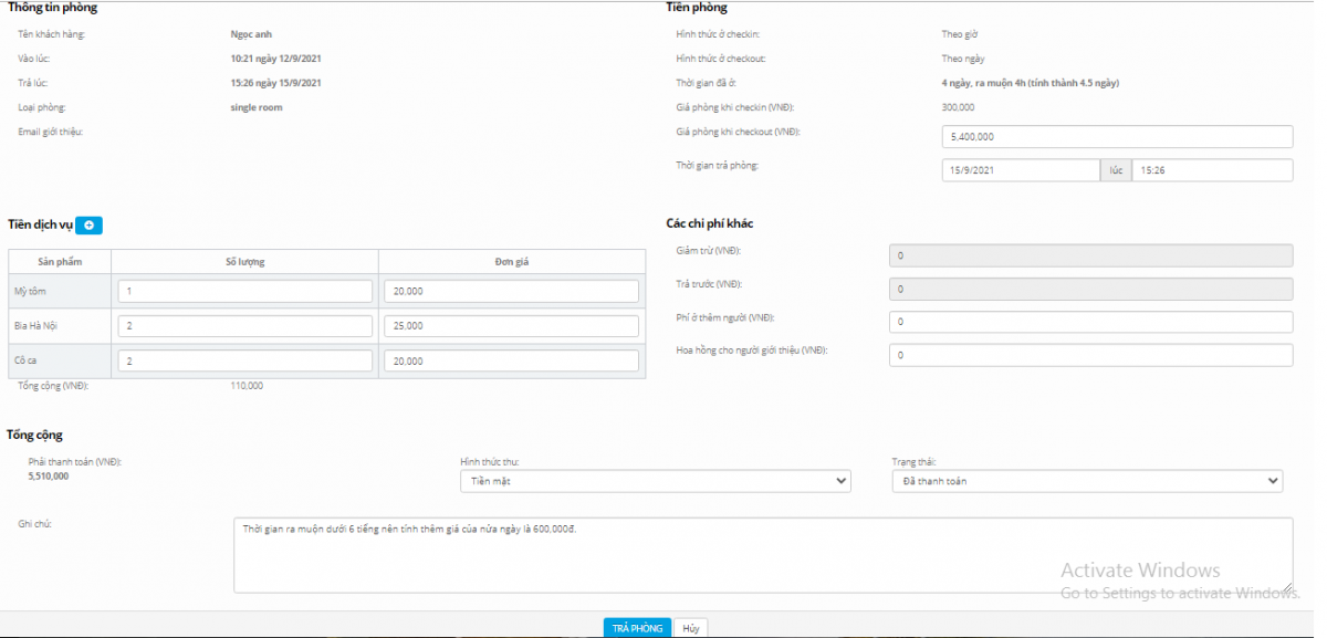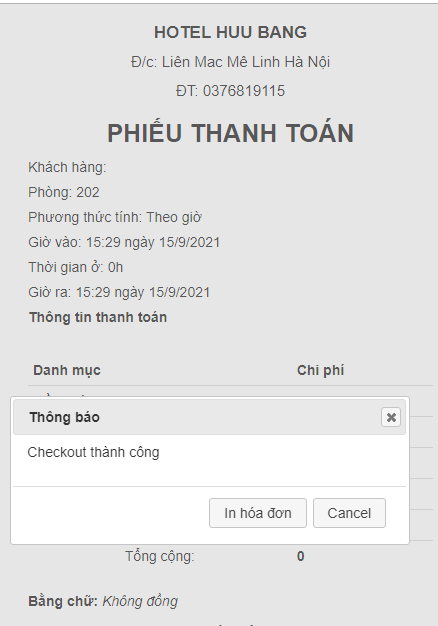 - Trả Phòng: Khách hàng trả phòng, hiển thị thông tin phòng, thông tin thanh toán, chọn “Trả Phòng"