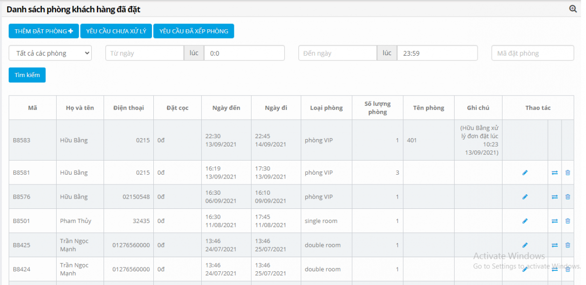 - Muốn xem chi tiết chọn icon cái bút để biết thông tin khách hàng, muốn xóa một yêu cầu chọn icon thùng rác với cơ sở sau khi cài đặt xong, muốn nhận phòng luôn cho khách chọn tương đương.
