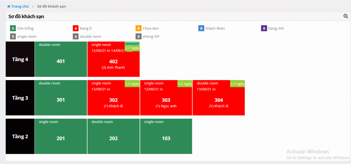 Hiển thị toàn bộ tầng, số phòng, trạng thái của mỗi phòng của cơ sở (đang ở, còn trống, thời gian vào..v.v.)