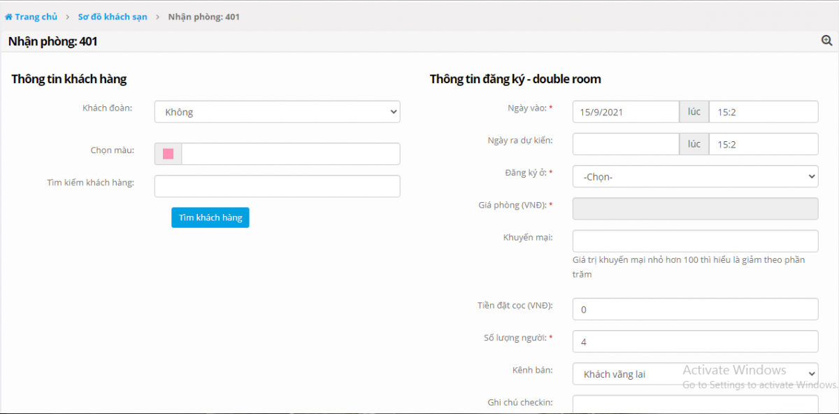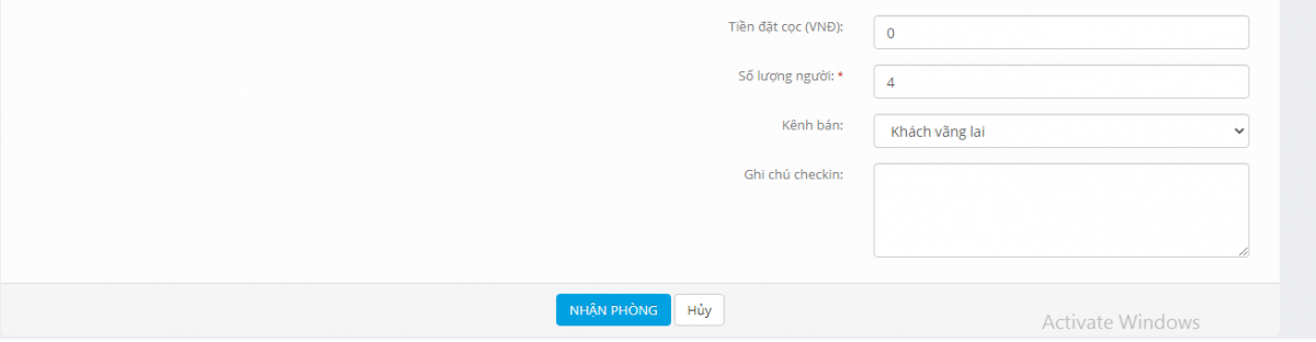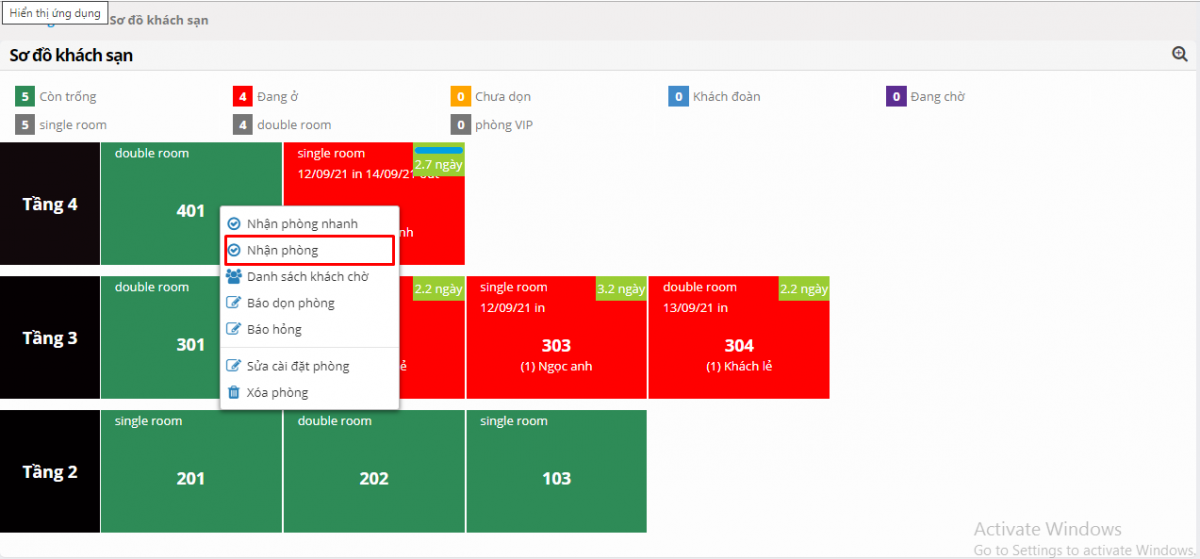 Khách hàng nhận phòng cuả cơ sở , điền thông tin cần thiết, chọn “Nhận phòng”. Sau khi khách hàng nhận phòng, lúc này phòng chuyển trạng thái màu xanh sang màu đỏ.