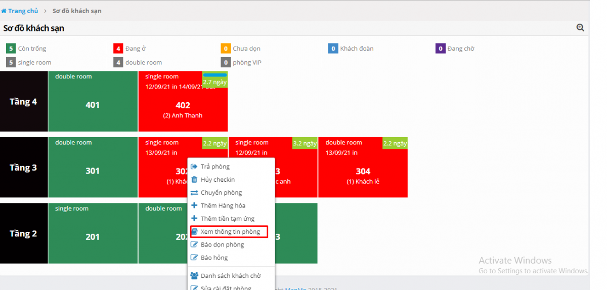 - Dọn phòng: sau khi khách hàng trả phòng, phòng chuyển sang trạng thái màu vàng, cần báo cho nhân viên đến dọn dẹp.