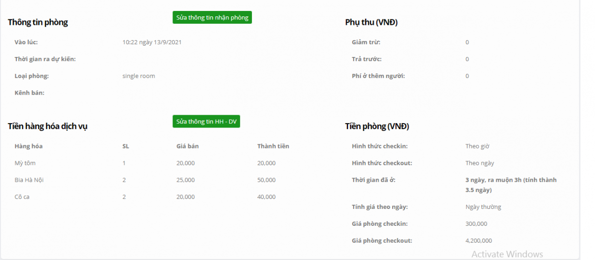 - Xem thông tin phòng, thời gian khách hàng đã vào và các dịch vụ mà khách hàng đã sử dụng: