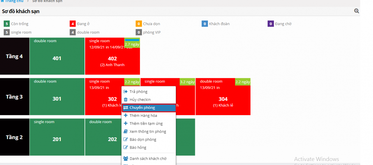 - Chuyển phòng: Chọn phòng ban đầu rồi chuyển sang phòng mà khách hàng mong muốn
