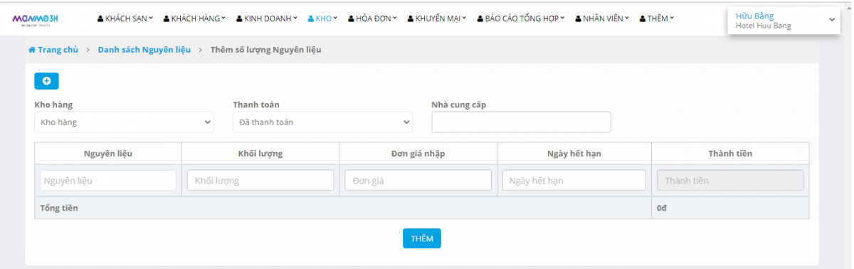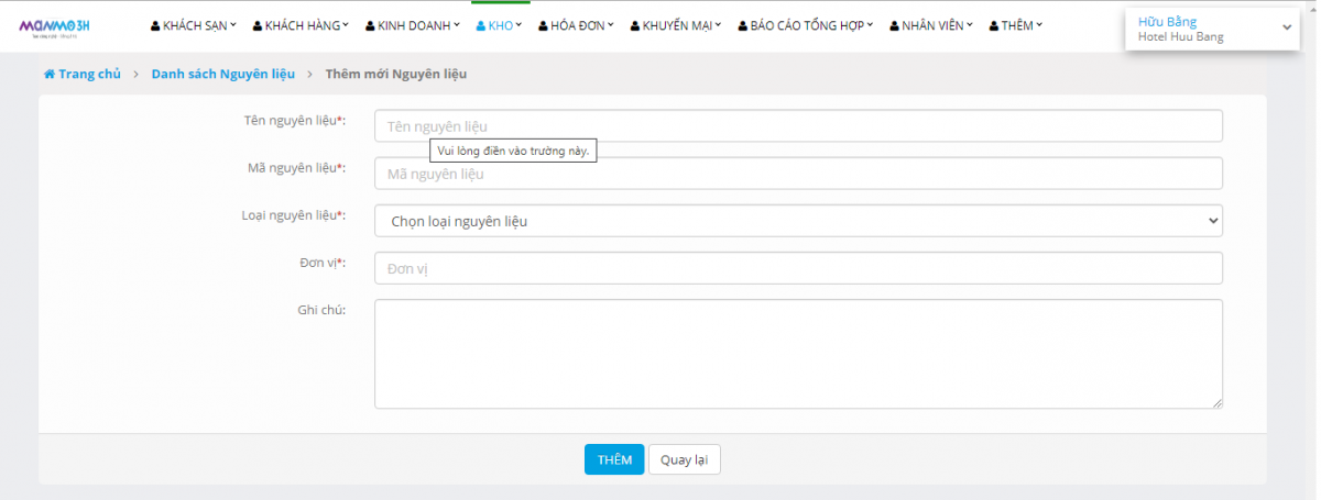 Điền đầy đủ thông tin tên nhóm nguyên liệu..... Sau khi điền xong bấm "Thêm"