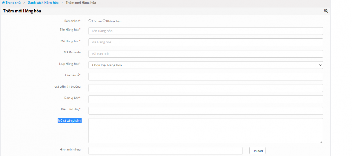 + Thêm hàng hóa: quý vị muốn nhập hàng hóa vào kho thì chọn "Thêm hàng hóa" . Sau khi điền đầy đủ thông tin thì chọn "Thêm" để lưu thông tin quý vị vừa cập nhập.