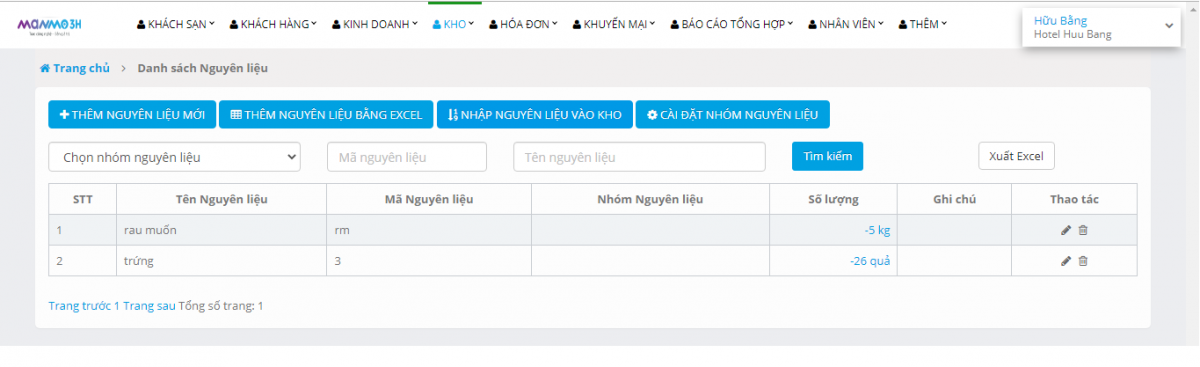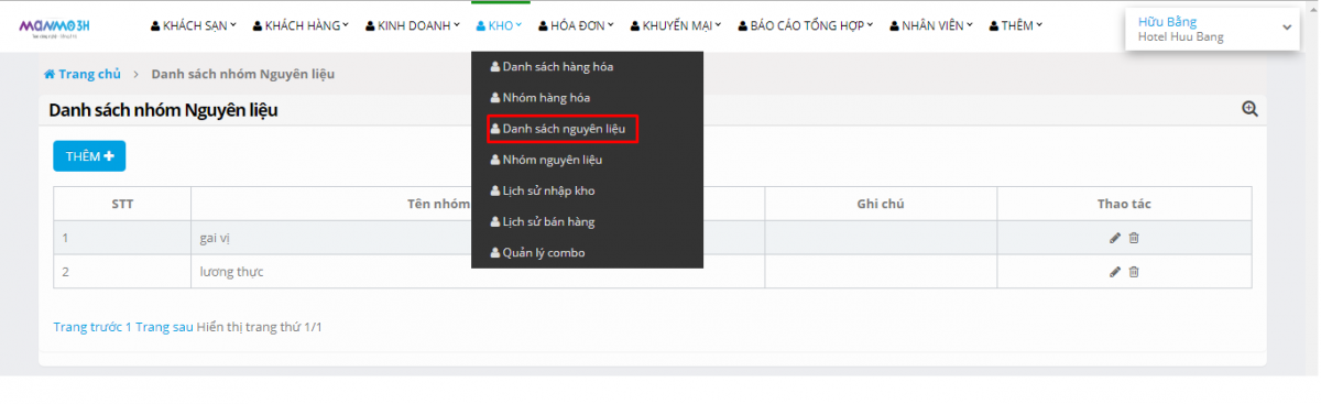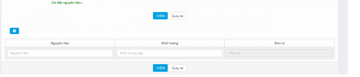 Chọn thêm khi quý vị muốn thêm nhóm nguyên liệu mới. Mặt khác có thể sửa hoặc xóa nhóm nguyên liệu ở mục "Thao tác"
