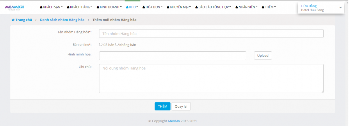 Điền đầy đủ thông tin tên nhóm hàng hóa..... Sau khi điền xong bấm "Thêm"