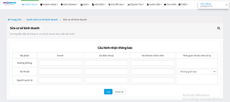 + Điền Email, số điện thoại, tài khoản nhân viên của từng bộ phận để khi có vấn đề gì hệ thông sẽ gửi thông báo đến nhân viên chịu trách nhiệm.